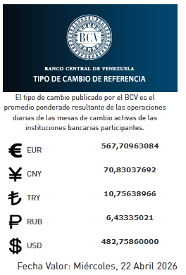 El Banco Central de Venezuela informó que al cierre de la jornada de este martes 21 de abril, la tasa de cambio del dólar para el miércoles 22 se ubicó en 482,75 bolívares, lo que representa un incremento de Bs 1,06 (+0,22%) en relación con la tasa anterior.